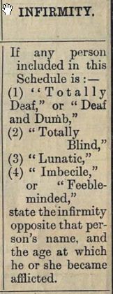 Today, 4 January 2012, all can be revealed in the 1911 census of England and Wales. The previously redacted infirmity column of the census form can be revealed. Findmypast.co.uk have done so on their images, not yet on Ancestry.